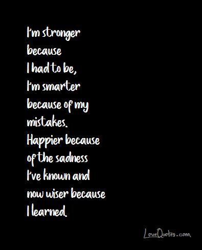 Im stronger because I had to be Im smarter because of my mistakes happier because of the sadness Ive known and now wiser because I learned. Im stronger because I had to be. Stronger Smarter Happier Wiser Learned Motivation. كان لابد لأنى مضطر لذلك كان علي التأكد لأني كنت مضطرة. Im stronger because I had to be Im smarter because of my mistakes happier because of the sadness Ive known and now wiser because I learned We. Popular Topics Quote of the Day Good Morning Quotes Good Night Quotes. Strength Quotes Wisdom Quotes.